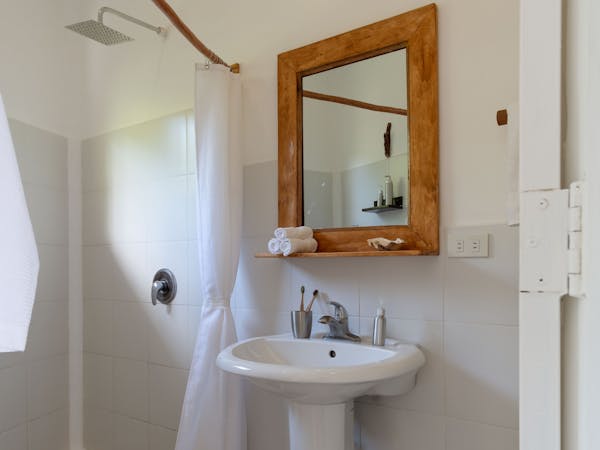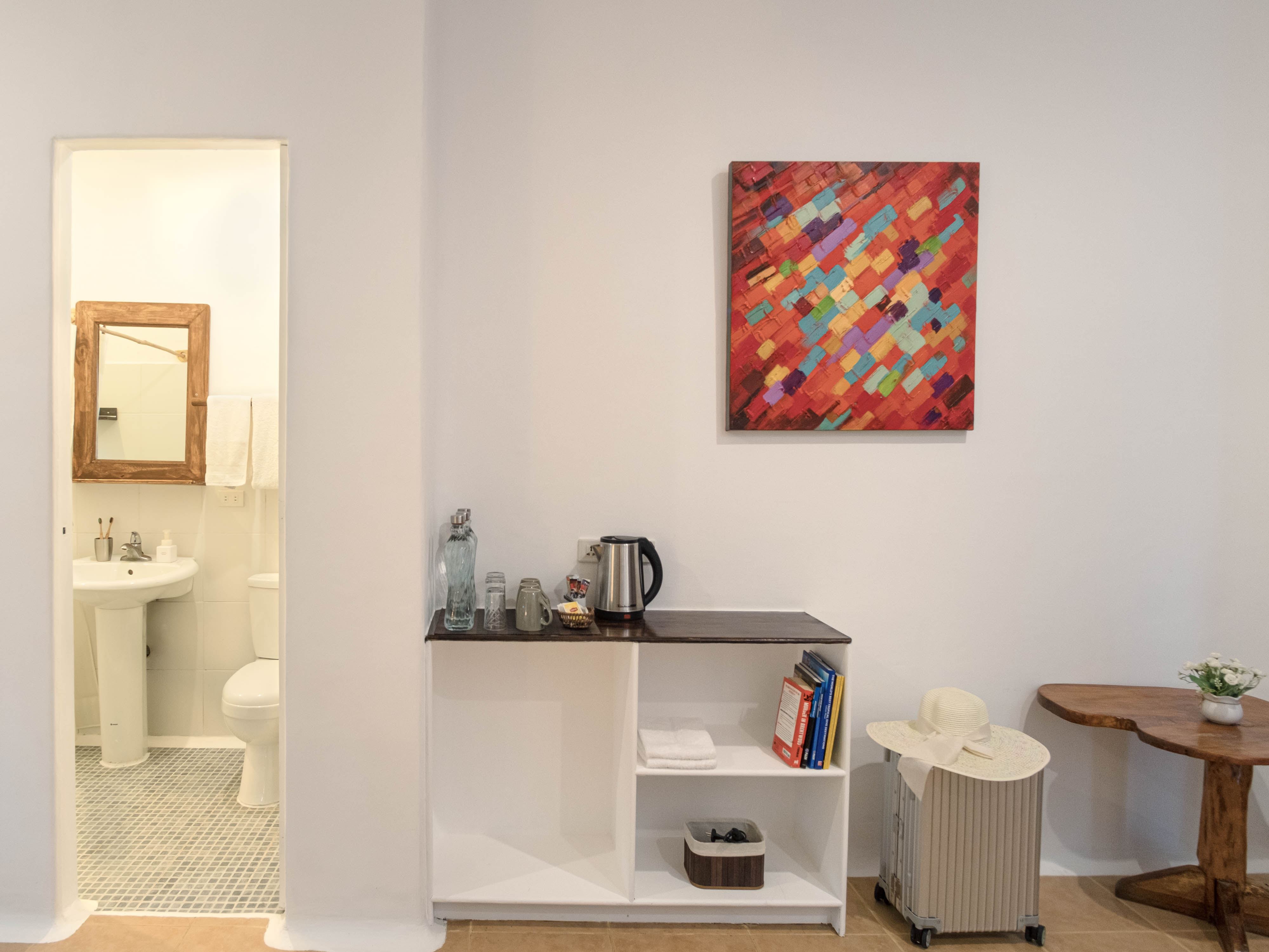 A hardwood queen-size bed and a single bed make our Terrace Rooms extremely flexible for 2 or 3 guests. Easy access to the ground-floor terrace and swimming pool, locally-produced furniture, modern amenities, a rainfall shower and a private balcony in the garden all add to the popularity of the Terrace Rooms.