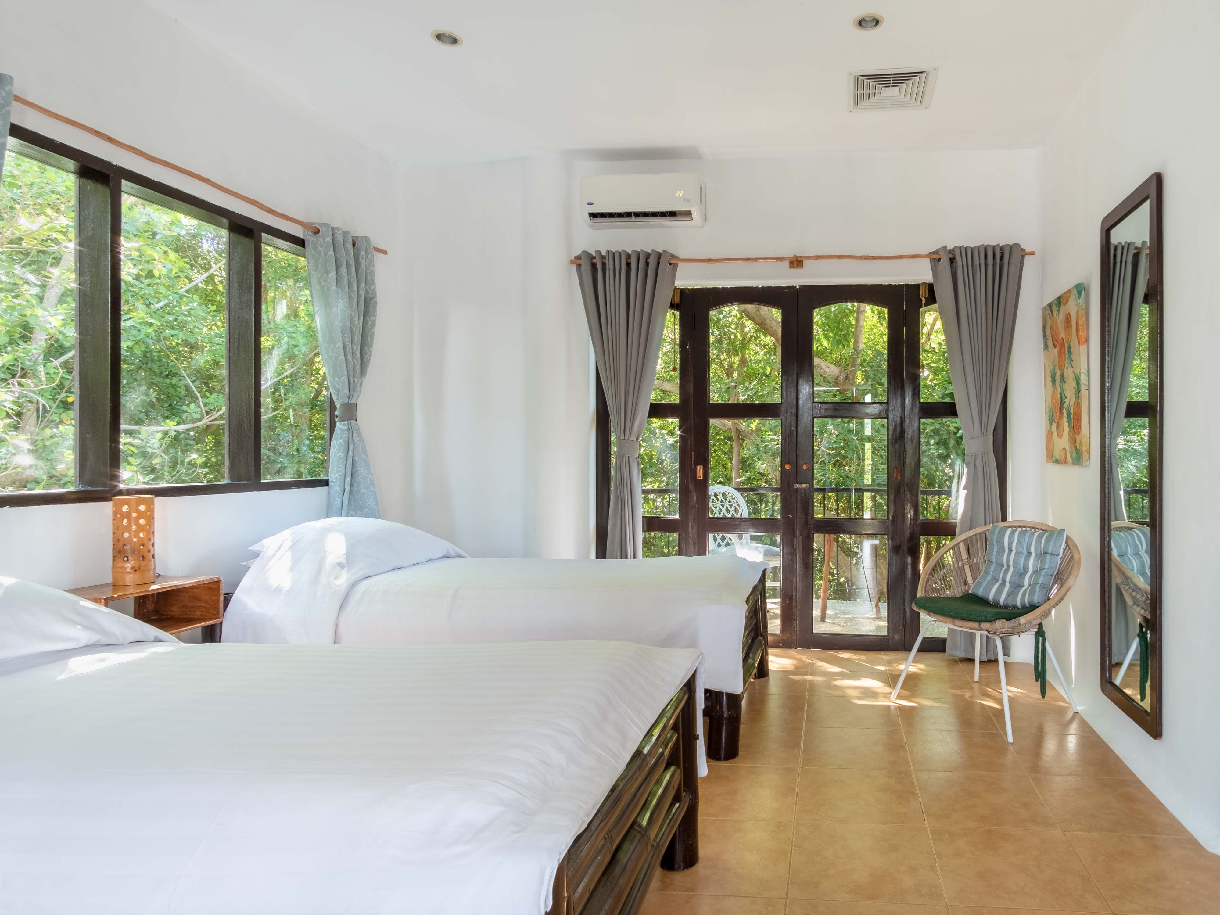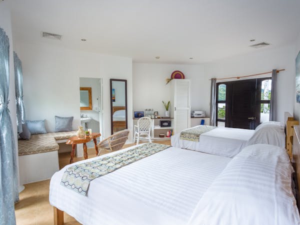 Our Deluxe Room offers comfort and space, whether you’re a party of 2, 3 or 4. The combination of shabby-chic beach house décor with two custom-made hardwood queen-size beds, makes our largest room the perfect base to escape, explore and experience southern Cebu. Located on the upper terrace with views of the coastline, our Deluxe Room also features a corner sofa, a private balcony overlooking the forest, a rainfall shower and modern amenities.